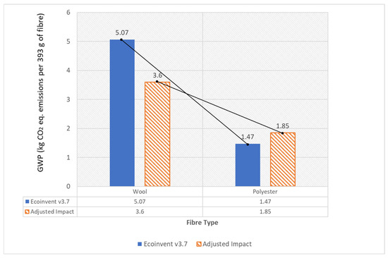 Comparison of GWP for wool and polyester in ecoinvent v3.7 vs. adjusted impacts.