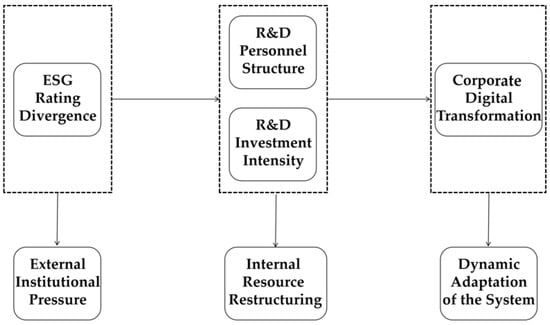 ESG rating divergence leads to inconsistent perceptions of a company’s ESG performance among investors and stakeholders, leading to uncertainty in the company’s sustainable development [4,36]. Therefore, companies with high ESG rating divergence are more motivated to increase R&D investment in digital technology and hire more R&D personnel for digital technology development. They employ digital solutions to deliver enhanced accuracy and real-time data gathering and analytical capacities, helping companies better measure and improve their ESG performance and reducing the degree of rating divergence among rating agencies [6,52]. Thus, we hypothesize that the mechanism by which high ESG rating divergence promotes corporate digital transformation is that such companies are more motivated to hire more R&D personnel and invest more funds in R&D. Our specific mechanism deduction diagram is shown in Figure 1.