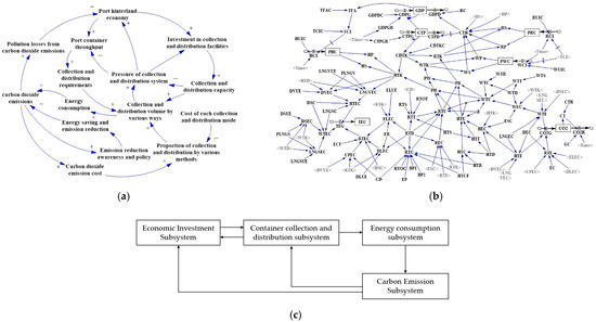 A comprehensive analysis was conducted of key factors influencing the GPCDS, including economic development, infrastructure, technology, transport structure, energy use, low-carbon strategies, and policy governance. Based on this, the model’s system boundary centers on four areas most directly related to low-carbon development: economic input, transport structure, energy consumption, and carbon emissions. Accordingly, the GPCDS framework comprises four core subsystems—economic investment, containerized transport, energy consumption, and carbon emissions—which together form the model’s causal loop diagram. Figure 1a presents the primary feedback relationships in the causal loop diagram, where the arrowheads indicate causes, arrows signify effects, and positive and negative symbols indicate beneficial and adverse impacts, respectively [45]. It includes six main key feedback loops: (1) Economic–Environmental Negative Feedback: Economic growth drives throughput and emissions, which in turn harm the environment and constrain growth. (2) Economic–Logistics Positive Feedback: Economic development boosts logistics investment, enhancing capacity and further supporting growth. (3) Capacity Regulation Negative Feedback: Rising system pressure triggers infrastructure expansion, which relieves pressure. (4) Demand–Congestion Negative Feedback: Increased throughput strains the system; insufficient capacity then limits future throughput. (5) Emission Cost–Mode Shift Positive Feedback: Internalizing carbon costs shifts mode choices toward low-carbon options. (6) Policy–Emission Reduction Negative Feedback: Higher emissions prompt policy responses and behavioral change, reducing emissions. Model variables and auxiliary variables were identified based on the influencing factors of GPCDS low-carbon development, as derived from the system’s feedback structure. On this basis, a system flow diagram for the GPCDS was constructed to facilitate the quantitative analysis of low-carbon development at Shanghai Yangshan Port, as in Figure 1b. The explanatory table of variables included in Figure 1b is shown in Table A1 in Appendix A. Figure 1c illustrates the internal logic linking the four subsystems. Economic investment improves transport infrastructure, boosting the capacity of the container collection and distribution system. This drives economic growth and increases throughput, leading to higher energy consumption and, consequently, greater carbon emissions. The resulting environmental degradation and economic costs feed back negatively on both investment and transport, forming a closed-loop system.