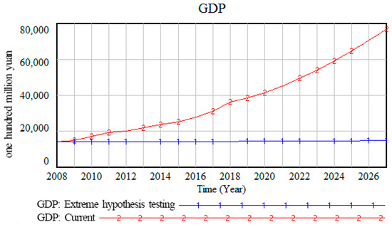 Extreme hypothesis testing is employed to evaluate the stability of state equations and ensure their validity under extreme conditions. This method involves assigning extreme values (e.g., zero or infinity) to specific model variables and assessing whether the resulting outputs are consistent with real-world expectations. In this study, the GDP equation was selected as a representative state variable for extreme testing. By setting the GDP growth rate to zero, an economic stagnation scenario was simulated. In this case, GDP is no longer driven by endogenous growth but depends solely on port infrastructure development and CO2 emissions. As expected, the simulated GDP curve closely matches real-world behavior but flattens noticeably, indicating slowed economic activity. The model also reflects a weakened feedback loop: lower GDP growth reduces investment, slows transport volume expansion, and leads to lower emissions. As shown in Figure 2, the simulation output is stable and plausible, with no divergence or unrealistic overshoot. The test supports the model’s internal logical consistency and reinforces its suitability for policy simulation under diverse scenario conditions.
