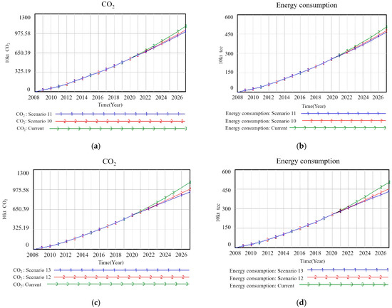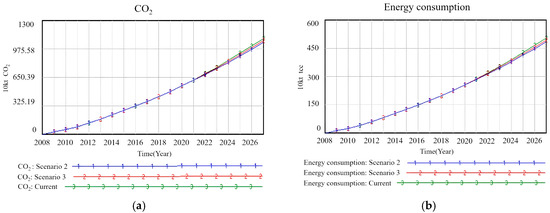 The simulation results corresponding to the above scenarios were generated by inputting the respective parameters into the system dynamics model, as shown in Figure 3. In the figure, the red curve represents the baseline scenario, while the blue curve corresponds to Scenario 1.