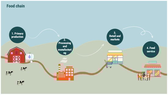 Initially, the chosen food chains were analyzed per chain segment, following the classification of the efficient protocol [] (see Figure 2). The efficient protocol is a pragmatic and integrated methodology for FW classification, analysis, causes and intervention designs and provides a clear definition of the chain segments (primary production, processing and manufacturing, retail and markets and food service) [,]. Consumer households were excluded from the analysis as this project focused on industrial food chain production (see Figure 2).