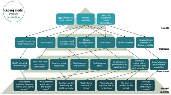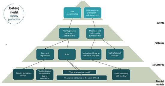In Figure 3, Figure 4, Figure 5 and Figure 6, the primary production iceberg models across the four food chains are shown. The arrows show the interlinkages between the events, patterns, structures and mental models. For example, if milk is contaminated in the milk chain—this is caused by poor hygiene in the barn—laws and regulations require the product to be thrown away because the priority in the chain is human health (see Figure 3).
