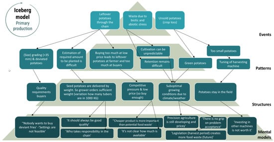 For each food chain, the iceberg models were systematically validated during co-creation sessions, which involved a minimum of ten representatives per food chain []. These sessions brought together food chain representatives and research experts to engage in discussions aimed at validating the iceberg models. Representatives were selected based on their direct involvement in the food chain (e.g., farmers, producers, retailers) or their roles within the broader food system surrounding the chain (e.g., veterinarians, potato seed traders). The selection was intentionally made without focusing on specific specializations in order to ensure a diverse and comprehensive group. Unfortunately, no retailers participated in the co-creation sessions.