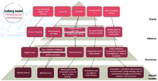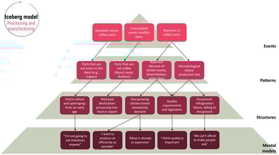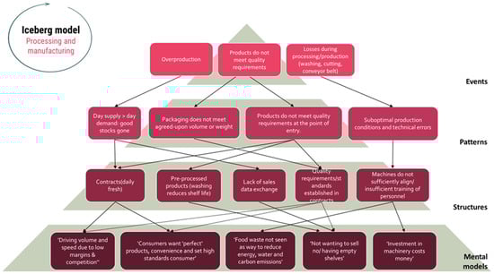 Globally, about 14 percent of the world’s food continues to be lost after harvest during primary production [], whilst a further 17 percent of our food ends up being wasted in retail, food service and in households particularly []. Results show that 186 Mt CO2-eq can be attributed to food waste in Europe annually []. This is 15% of the entire food supply chain []. About 6–8% of all human-caused greenhouse gas emissions could be reduced if we stopped wasting food []. This makes reducing food wastage (FW) a major sustainability challenge []. Reducing FW prevents the waste of land, water, energy and other resources that are part of our food systems and is therefore essential to improving sustainability []. FW can be understood as a symptom of an unsustainable food system. In addition to addressing symptom control, such as the reduction and reutilization of food waste streams, interventions aimed at mitigating or preventing food waste should also target the underlying systemic patterns of behaviour, systemic structures and mental models that perpetuate the occurrence of food waste. This means that a systems approach is needed [,]. Currently there is a lack of studies that adopt a systemic approach to account for FW in the food system and, more specifically, within food chains []. A previous literature review by Canali et al. identified the following drivers behind systemic food waste []: (A) inherent characteristics of food; (B) social and economic factors; (C) individual non-readily changeable behaviours; (D) other priorities targeted by private and public stakeholders; (E) diversified factors, such as mismanagement, inefficient legislation, lack of awareness or information; and the sub-optimal use of available technologies, which could be more promptly changed. Another literature review by Priefer et al. showed the various drivers behind FW [], namely (a) process- and market-based standards, (b) non-compliance with food safety requirements, (c) exceeding expiry dates and (d) marketing standards or logistic constraints, but also (e) consumer preferences and (f) societal trends like growing prosperity, declining food prices, rising number of single households and the increasing employment of women []. These literature outcomes are quite broad and there is no direct comparison based on case studies between food chains of a specific nature (such as poultry, fresh produce, etc.). Another point that requires attention is that the drivers of FW are identified but they are not placed within the hierarchical context of a systems approach, leading to a lack of insight into how specific FW hotspots link to underlying behaviour patterns, structures and mental models. Food waste hotspots are events that result in a considerable amount of food waste and therefore require action []. Current literature reviews provide too limited an understanding of the interrelations within the system to identify where an intervention should be targeted and/or could be most effective in the food supply chain. The food supply chain consists of several chain segments: primary production; processing and manufacturing; wholesale, retail and markets; and food service. Primary production can be defined as activities that occur at the farm/fish farm/fishing boat level. Processing and manufacturing can be defined as all activities occurring in a food processing industry and carried out in order to obtain a finished product from incoming raw materials. Wholesale can be defined as business-to-business operations that buy and sell large quantities of goods. Retail can be defined as an operator that sells goods to consumers. Food service comprises the businesses and people engaged in preparing meals and drinks for consumption outside of the home [].