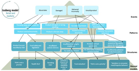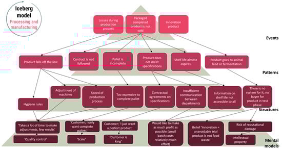 In each studied chain segment, the FW hotspots were initially defined by the researchers through the literature review and interviews with operational experts. As mentioned above, a FW hotspot is a location in the chain where a significant amount of waste occurs and therefore a place where food waste can be saved []. Following the classification of the iceberg model, these FW hotspots were marked as “events” (see Figure 1).
