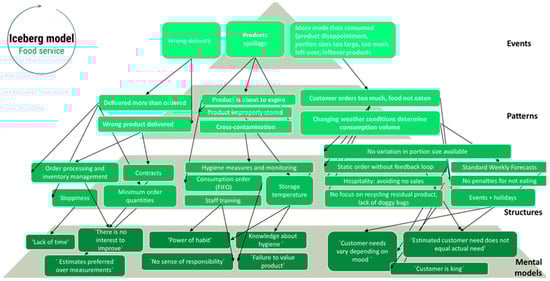 The purpose of the co-creation sessions was to develop a clear overview of potential leverage points for food waste (FW) reduction within the food chain, including insights into mental models, structures and behavioural patterns. Some outcomes were categorized across multiple levels (events, patterns, structures and mental models). In such cases, the classification was determined by consensus, reflecting the specific context of the discussed food system. In the first phase of the co-creation process, participants were given the opportunity to provide feedback on the iceberg models. The models were printed out and attendees were invited to attach post-its with their comments directly to the relevant sections of the iceberg models. Following a group discussion, the final versions of the iceberg models were established.