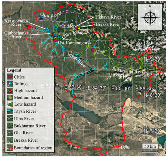 In the present study, the analysis and assessment of surface water pollution in East Kazakhstan Region were conducted in accordance with the unified classification system for six rivers: Breksa, Tikhaya, Ulba, Glubochanka, Krasnoyarka, and Oba (Figure 1). Figure 1 illustrates the river basins of the Irtysh, Bukhtarma, Oba, and Ulba, with each basin represented in a distinct color. The Tikhaya and Breksa rivers are tributaries of the upper Ulba River, located upstream of the city of Ridder (Figure 2). The Glubochanka and Krasnoyarka rivers are small right-bank tributaries of the Irtysh River (Figure 2). As we can see from the maps presented, it is the small rivers under study that are under the influence of dangerous tailings ponds [25]. To improve clarity, coordinate grids and scale bars were added to Figure 1 and Figure 2. The GIS-based map data illustrate the locations of the studied rivers and the main sources of anthropogenic impact. It should be noted that the distances between sampling points and specific pollution sources are approximate due to map scale limitations and the lack of detailed hydrographic data.