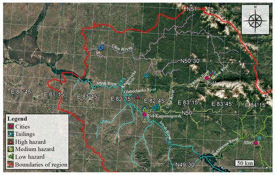 Figure 1 and Figure 2 show the Tailings Hazard Index according to research on mapping of tailings in Central Asia: high, medium, and low [25].