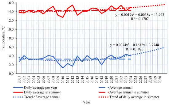 The analysis of weather data showed that temperature trends align with global patterns and indicate a gradual increase in air temperature in the region (Figure 3). Despite the lows recorded in 2010 and 2012, the overall trend remains upward. Notably, although the average annual temperature decreased in 2012, the summer of that year was among the hottest. A similar discrepancy between annual and summer temperatures was observed again in 2024. Overall, the years following 2018 have been the warmest in the region throughout the entire observation period. The trend lines plotted in accordance with Equation (2) (R2 = 0.17) for average annual temperatures and Equation (3) (R2 = 0.19) for summer temperatures also clearly demonstrate a steady upward trend in temperature throughout the region.
