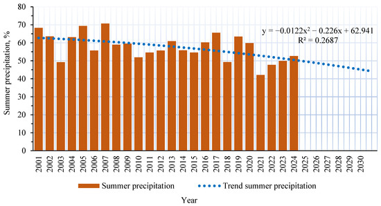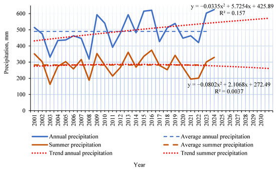 Figure 4 presents data on precipitation levels in the region (annual and summer values). On one hand, the graph indicates a gradual increase in precipitation, with both indicators exceeding the average for the study period since 2009. However, in recent years, starting from 2020, precipitation has been declining. The trend lines were constructed using Equation (4) (R2 = 0.16) for the annual average and Equation (5) (R2 = 0.004) for the summer period. The forecast suggests a slight increase in average annual precipitation, while summer precipitation is expected to decrease. In general, this trend correlates with rising temperatures and reflects the broader picture of climate warming—summers in the region are becoming hotter and drier.