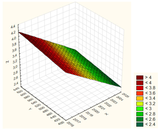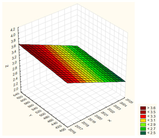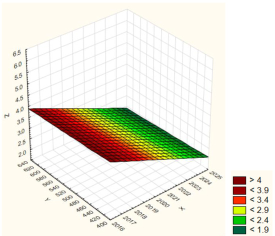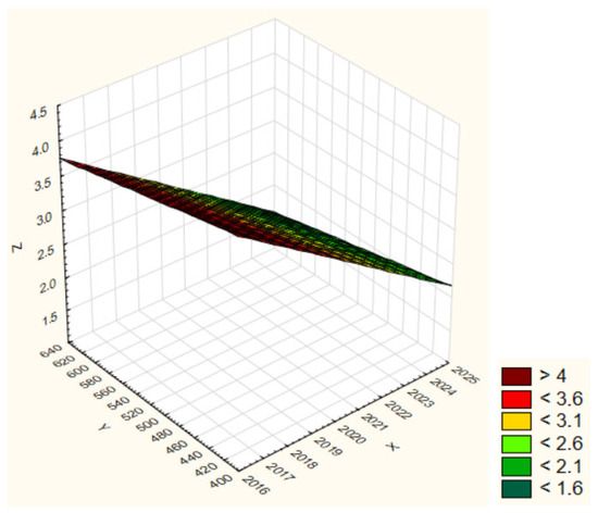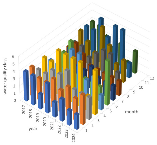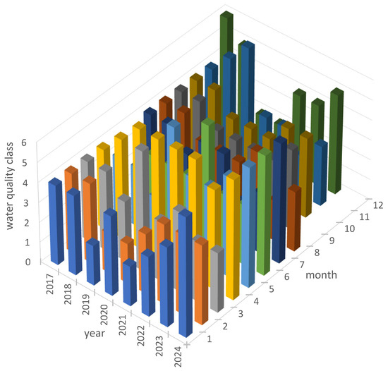 An analysis of the three-dimensional relationship between water quality class, precipitation, and time (2017–2024) for the Ulba River (Figure 16) showed a consistent trend toward improved water quality with increasing precipitation. Under conditions of low precipitation (400–460 mm), higher z-values were recorded, corresponding to lower water quality—ranging from polluted to heavily polluted classes. As precipitation levels exceed 600 mm, the quality class decreases, indicating satisfactory to good water quality. Simultaneously, a clear temporal trend of water quality deterioration was observed: even with consistent precipitation levels, the pollution class tends to rise in later years. This suggests the influence of anthropogenic factors such as urbanization, wastewater discharge, and changes in the hydrological regime. Thus, while precipitation remains an important natural regulator of water quality in the Ulba River, the progressive increase in pollution over time highlights the need for additional environmental control measures.