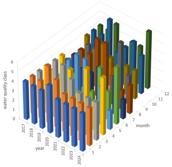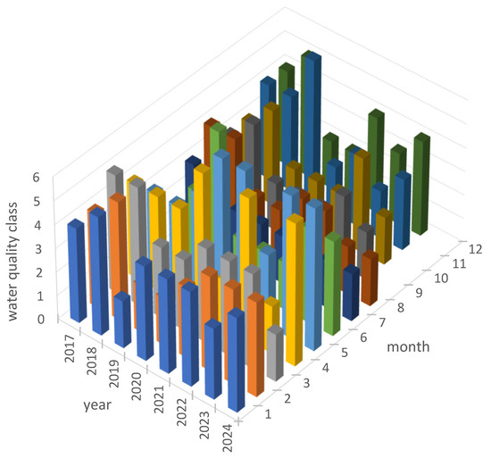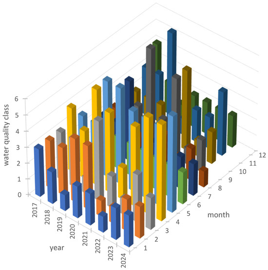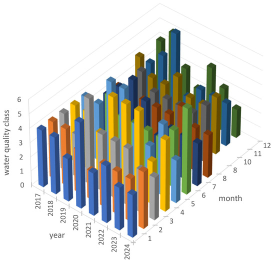 The obtained equation coefficients reflect the multidirectional influence of the studied factors. A negative value for the time variable (−0.1096) indicates a tendency toward improving water quality over time, which may result from effective environmental protection measures or changes in the hydrological regime. Conversely, the positive coefficient for precipitation (+0.0008) suggests a slight deterioration in water quality with increased water availability, possibly due to the flushing of pollutants from the catchment surface. Nevertheless, the dominant influence of the time variable indicates a generally positive long-term trend in the condition of the water body. The coefficient of determination was R2 = 0.10, indicating a low degree of explanation for variations in water quality class. Nevertheless, the model may still be useful for preliminary assessments of the influence of temporal and climatic factors on the river’s ecological status.
