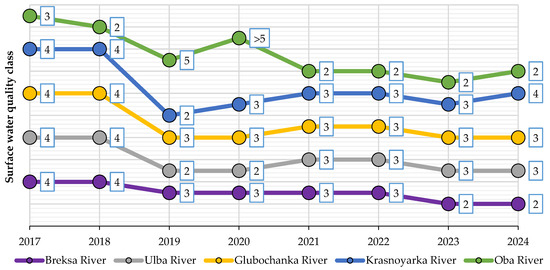 When comparing precipitation patterns with the dynamics of surface water quality classes, various types of interrelationships were observed across individual rivers. For most rivers, such as the Breksa, Tikhaya, and Oba, there is a weak or no linear correlation between annual precipitation and water quality, as confirmed by correlation analysis. This suggests that hydrochemical parameters are only marginally influenced by annual water availability, particularly in settings where local pollution sources dominate. In contrast, a weak positive correlation was identified for the Krasnoyarka, Ulba, and, to a lesser extent, the Glubochanka rivers, likely due to increased surface runoff from contaminated areas during periods of high precipitation.