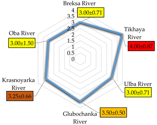 Thus, this study employed the unified water quality classification system officially adopted in the Republic of Kazakhstan, which was developed in accordance with the Environmental Code [21] and regulatory documents of the National Hydrometeorological Service (RSE Kazhydromet) [22]. The application of this system ensures the comparability of the obtained data with results from state monitoring programs and enables an objective assessment of the condition of water bodies in a format that is consistent with internationally recognized water quality evaluation standards.
