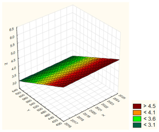 The negative value of the coefficient for variable x (−0.2234) indicates a tendency to decrease the quality class of surface waters over time, which may be due to a gradual improvement in the state of the river ecosystem or the results of environmental protection measures. The negative value of the coefficient at y (−0.0008) indicates that an increase in precipitation has a weak positive effect on water quality, possibly due to dilution of pollutants and improvement of the hydrological regime of the river.