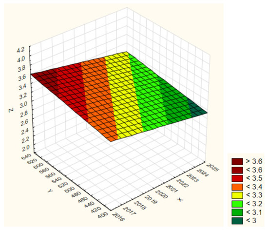 Based on the graphical relationship, a model was developed to describe the combined effect of precipitation and time on the water quality class in the Krasnoyarka River. The model is expressed by the following Equation (11):