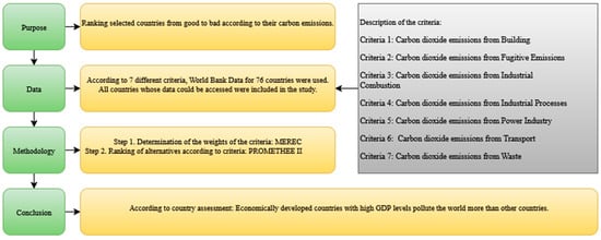 In this study, annual carbon emission data for the year 2022, sourced from the most recent World Bank datasets, were used to analyze Turkiye’s carbon emission profile. Emissions originating from the industrial, transportation, and industrial processes sectors were examined using the MEREC and PROMETHEE II methods within the framework of a multi-criteria decision-making (MCDM) approach. The MEREC method was applied to objectively determine the weights of the criteria, while the PROMETHEE II method was used to rank the alternatives (countries) from best to worst based on these criteria []. This methodological approach enabled a comprehensive and comparative evaluation of countries in the context of carbon emissions.