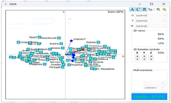 The positions of the alternatives with respect to the criteria, along with the quality graph of the PROMETHEE II analysis summarized above, are presented in Figure 2. According to the results, the analysis quality is 89.4%. A score of over 85% on the GAIA scale is considered reliable [].