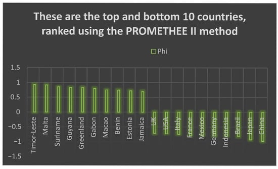 In this study, the decision matrix presented in Table A1 was used. The matrix includes seven criteria, which are listed in Table 1. The criterion weights were calculated using the MEREC method, and the methodological structure of MEREC is explained in Equations (1)–(6). The weight values obtained through MEREC are presented in Table 2. Based on the calculated weights, the alternatives were ranked using the PROMETHEE II method. The ranking results provided in Table A2 list the countries from best to worst according to the selected criteria.