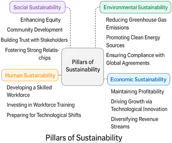 The four pillars of sustainability, which include the environmental, economic, social, and human aspects, are shown in Figure 1, with environmental sustainability as the essential core element for the energy sector. The environmental pillar focuses on decreasing greenhouse gas emissions and promoting sustainable energy resources because these elements are essential to reduce energy extraction and utilization impacts on the environment. The energy sector maintains a dual connection with environmental sustainability because its extraction activities produce significant emissions, but its utilization activities create paths to decrease environmental damage. These challenges require AI-driven strategies that focus on optimizing renewable energy integration and minimizing waste to resolve them effectively.