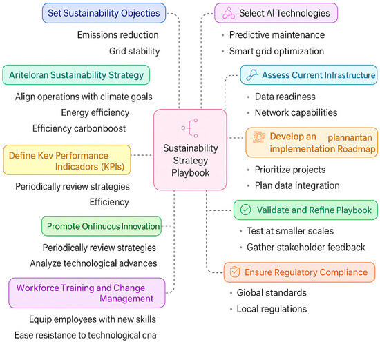 This research develops an energy sector-specific leadership playbook through actionable recommendations for implementing AI solutions to solve industry-specific sustainability problems. The study combines academic research with industry insights and practical examples to achieve its objectives. The investigation begins with a thorough evaluation of the existing literature that emphasizes AI technology applications for renewable energy optimization alongside emissions reduction strategies and grid stability improvements. The assessment demonstrates predictive renewable energy generation tools that enhance solar and wind power incorporation into present power grids while decreasing dependence on conventional energy systems. The evaluation investigates how AI technology helps companies detect emissions while predicting upcoming trends to meet regulatory requirements and create sustainable environmental strategies [16,17].