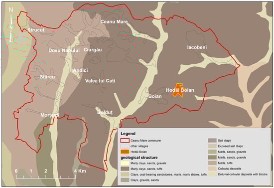Geological map illustrating the location of Hodăi-Boian village, Ceanu Mare commune [40].