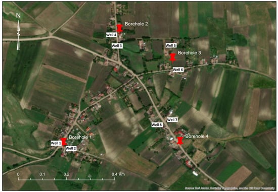 Water samples were collected exclusively from domestic wells located in the immediate vicinity (within 50 m) of the four geotechnical boreholes, ensuring the selection of points with the highest hydrogeological relevance and potential exposure to contamination sources. In total, eight wells were sampled for this study.