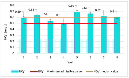The analytical results of the water from the wells adjacent to the boreholes reveal a troubling and spatially coherent pattern of contamination. In all the sampled wells, the NO3− concentrations ranged between 39.7 and 48 mg/L, remaining below the World Health Organization (WHO), Romanian, and EU threshold of 50 mg/L [10,11,12,31] (Figure 7), while the NO2− levels varied from 0.5 to 0.69 mg/L, exceeding the maximum admissible limit of 0.5 mg/L in most cases (Figure 8). The omnipresence of NO3−exceedances, with a spatial gradient matching proximity to animal husbandry and manure storage, underscores chronic overloading of the aquifer system by agricultural practices. The pattern is aggravated in wells adjacent to active livestock stables.