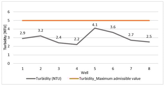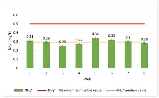 The NH4+ concentrations determined in the samples taken from the eight wells were in the range of 0.25–0.38 mg/L, values that do not exceed the maximum allowed limit of 0.5 mg/L (Figure 9), according to national and EU standards [31,52,53]. However, the constant presence of NH4+ in these concentrations may indicate a possible anthropogenic influence or processes of decomposition of organic matter in the catchment area, suggesting the need for continuous monitoring to prevent possible future increases. Episodes of NH4+ elevation reflect recent or ongoing organic contamination, likely related to manure leaching or poorly managed septic effluents.