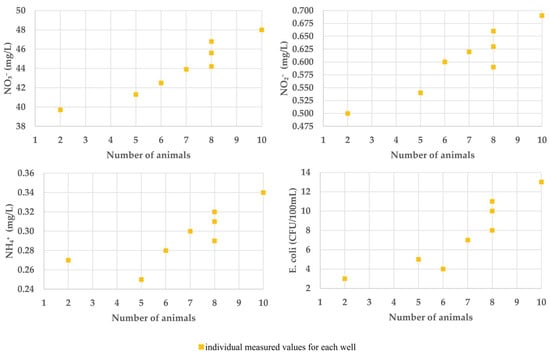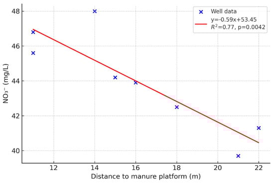 Although the NO3− and NH4+ concentrations in the well water were within the legal limits (NO3−, 39.7–48 mg/L and NH4+, 0.25–0.38 mg/L), none of the monitored wells complied with the drinking water standards for NO2− (0.5–0.69 mg/L; legal limit 0.5 mg/L) or for microbiological parameters (5–13 CFU/100 mL; legal limit 0), which poses a significant public health risk, especially for vulnerable groups. Frequent detection of E. coli confirms the aquifer’s vulnerability and the urgent need for action.