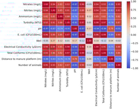 Pearson correlation coefficients were calculated for all the pairwise combinations of water quality indicators and potential risk factors (e.g., nitrate, nitrite, ammonium, turbidity, pH, E. coli, distance to manure platform area, number of animals per household) using IBM SPSS v27 (IBM Corp., Armonk, NY, USA). The strength of each correlation was interpreted according to the following scale: |r| < 0.3 = weak; 0.3 ≤ |r| < 0.5 = moderate; 0.5 ≤ |r| < 0.7 = strong; |r| ≥ 0.7 = very strong [51]. Potential outliers were identified and managed through standardized protocols, and the reproducibility of the analytical results was verified through duplicate sampling and laboratory cross-validation.