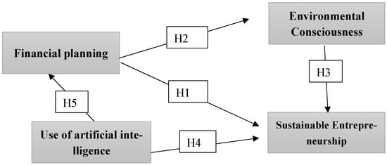 Figure 1 shows the proposed hypothetical theoretical model, which has five research hypotheses detailed below. The influence of financial planning on sustainable entrepreneurship has been supported by various studies. Research has demonstrated that financial planning is closely related to sustainable business success and environmental performance at the organizational level [] and to better sustainability outcomes in new ventures []. Additionally, financial planning in the prelaunch phase of a sustainable business can help entrepreneurs evaluate both the economic viability and environmental impact of their ideas, leading to more informed decisions about sustainable venture creation []. These findings are particularly relevant in emerging economies such as Ecuador, where inadequate financial and sustainability planning is identified as one of the main reasons for the failure of sustainable small businesses []. Recent research by [] further demonstrates that comprehensive financial planning is essential for balancing economic viability with environmental objectives in emerging markets. Although financial planning alone does not guarantee sustainable business success, it is suggested that fostering these integrated planning skills among potential entrepreneurs could improve both financial and environmental outcomes []. Consequently, it can be inferred that financial planning positively influences sustainable entrepreneurship development among merchants in Machala, Ecuador. Therefore, the following hypothesis is formulated: