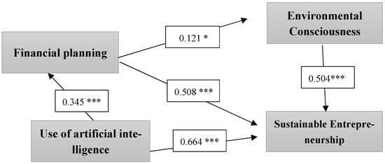 Regarding discriminant validity, two indicators were calculated. First, following the [] criterion, discriminant validity exists as the square root of the AVE (numbers in the diagonal) when it is greater than the correlations with other constructs (numbers outside the diagonal in the same row and column); as shown in Table 4, all constructs exceeded this threshold. Second, the heterotrait–monotrait ratio (HTMT) criterion was used, where Financial Planning has a value of 0.455, Environmental Consciousness has a value of 0.686, Sustainable Entrepreneurship has a value of 0.567, and Use of Artificial Intelligence has a value of 0.478; all these values remain below 0.85 [], confirming that the measurement model has strong discriminant validity.