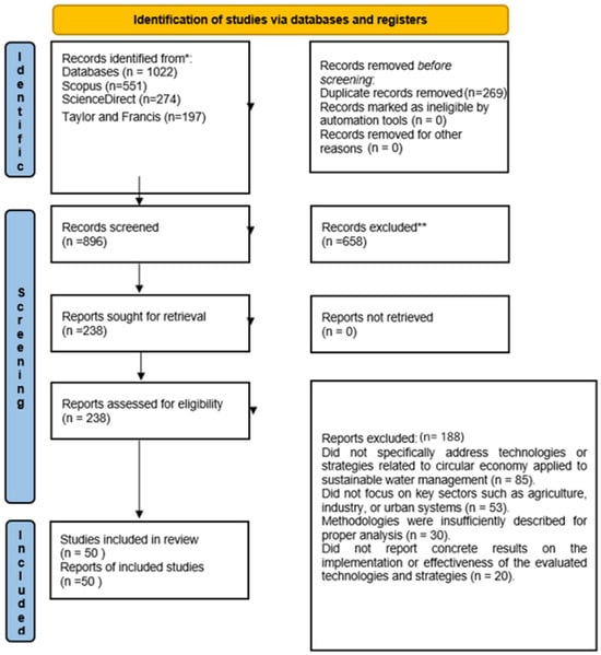 Systematic searching of the selected databases (Scopus, ScienceDirect, and Taylor & Francis) along with hand search records initially identified 1022 publications for the period 2018–2024. After removing 269 duplicates, 753 unique records were obtained and screened, resulting in 238 articles for full-text evaluation. Rigorous application of inclusion and exclusion criteria led to the final selection of 50 studies that met all the established requirements. The main reasons for exclusion were as follows: not specifically addressing technologies or strategies related to circular economy applied to sustainable water management (n = 85), not focusing on key sectors such as agriculture, industry, or urban systems (n = 53), insufficiently described methodologies (n = 30), and absence of concrete results on implementation or effectiveness (n = 20). The temporal distribution of publications showed an increasing trend, with a notable increase from 2020 onwards, reflecting the growing academic interest in circularity approaches to water management.