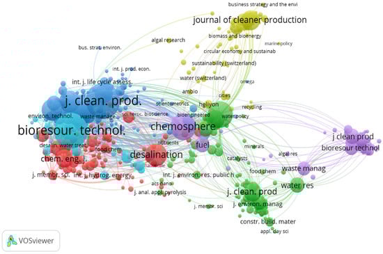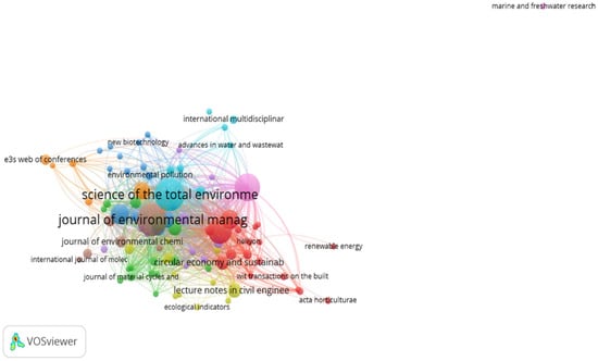 The term co-occurrence analysis identified four main thematic clusters from the circular economy and water sustainability literature (Figure 2). First, the cluster (red) focused on terms such as “waste management”, “sustainability”, and “life cycle”, reflecting a common interest in waste management strategies and life cycle approaches. Second, the cluster (yellow) grouped concepts related to wastewater treatment and reuse, such as wastewater treatment, water reuse, and wastewater treatment plant. Thirdly, the green cluster focused on technical aspects such as “adsorption”, “heavy metal”, and “scanning electron microscopy”, while the fourth cluster (blue) grouped terms related to the valorization of organic waste, such as “biofuel”, “biogas”, and “biorefinery”. On the other hand, the co-citation analysis of scientific journals (Figure 3) identified Science of the Total Environment and Journal of Environmental Management as the two predominant sources of publication and academic exchange in this field. In addition, journals such as Ecological Indicators, Journal of Cleaner Production, and Circular Economy and Sustainability emerged from the analysis as the most relevant nodes, reflecting the diversity of approaches from environmental, productive, and sustainability perspectives.