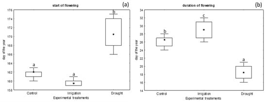 Flowering phenology of Brassica alba cv. Palma in different experimental treatments (control vs. irrigation vs. drought); (a) flowering start, (b) flowering duration. The flowering start is shown as the day from the 1st January, according to the Julian calendar. Means from 2023–2024 are presented. Significant differences (p < 0.05) between the experimental treatments are marked with different letters, according to the Kruskal-Wallis H. The dots within the boxes indicate median values, and the whiskers show min–max values.