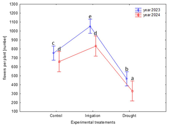 Number of flowers per plant in B. alba cv. Palma depending on the different experimental treatments (soil moisture levels: control: 2023—56% and 2024—48%; irrigation: 2023—72% and 2024—65%; drought: 2023—35% and 2024—29%) and the study years. Tukey’s HSD test was applied for log-transformed data; however, the presented data are not transformed. Statistically significant differences (p < 0.05) between the means are marked with different letters (the treatment × year effect is shown); the whiskers show the confidence intervals (±0.95).