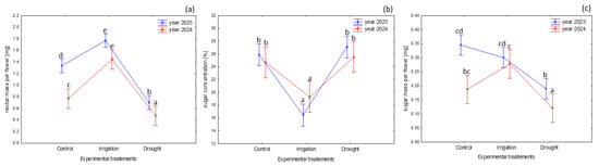 Nectar traits in B. alba cv. Palma depending on the different experimental treatments (soil moisture levels: control: 2023—56% and 2024—48%; irrigation: 2023—72% and 2024—65%; drought: 2023—35% and 2024—29%); (a) nectar amount secreted per flower life-span (mg); (b) nectar concentration (%); (c) amount of nectar sugar produced during flower life-span (mg) in 2023 and 2024. Tukey’s HSD test was applied for log-transformed data; however, the presented data are not transformed. Significant differences (p < 0.05) are marked with different letters (the treatment × year effect is shown); the whiskers show the confidence intervals (±0.95).