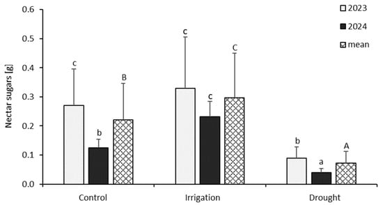 Nectar sugar yield per white mustard plant, depending on the different experimental treatments (soil moisture level: control: 2023—56% and 2024—48%; irrigation: 2023—72% and 2024—65%; drought: 2023—35% and 2024—29%) in 2023 and 2024. Tukey’s HSD test was applied for log-transformed data; however, the presented data are not transformed. Significant differences between the means (p < 0.05) are marked with different letters: A–C between treatments, a–c treatment × year effect; the whiskers show ± SD—standard deviation.