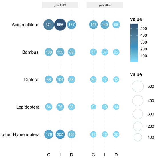Bubble plot illustrating the distribution of the insect visitor groups among the experimental plots (C—control vs. I—irrigation vs. D—drought treatments) in B. alba cv. Palma in 2023 and 2024. Pearson Chi-squared test: Apis mellifera 2023 and 2024—p < 0.0001, Bombus 2023—p = 0.012, Bombus 2024—p = 0.095; other Hymenoptera 2023—p ≤ 0.0001, other Hymenoptera 2024—p = 0.534; Diptera 2023—p < 0.0001, Diptera 2024—p = 0.4771; Lepidoptera 2023 p = 0.002, Lepidoptera 2024—p = 0.558. The values are standardized (for details see Section 2.6).