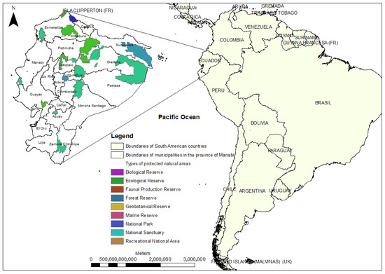 The study population is made up of the National System of Protected Areas of Ecuador, which covers 26,208,785.38 ha and represents 19.42% of the territory. Due to the country’s geographical location, there is a high level of biodiversity. It has 14 national parks: Machalilla, Cayambe, Coca, Cotacachi–Cayapas, Cotopaxi, Llanganates, Sangay, El Cajas, Podocarpus, Yacuri, Antisana, Sumaco–Napo–Galeras, Río Negro Sopladora, and Yasuní T/T [58]. Figure 4 shows a map of the geographical location of Ecuador, which reflects the location of protected natural areas.