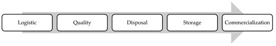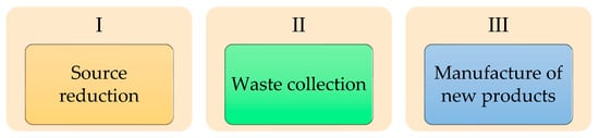 To achieve proper waste management, it is crucial to evaluate the entire management chain, from the production of waste to the implementation of the stages of collection, transportation, storage, transformation, utilization, and manufacture of new materials. The implementation of these stages will vary according to the type of waste to be managed or recycled, as shown in Figure 1 [22].