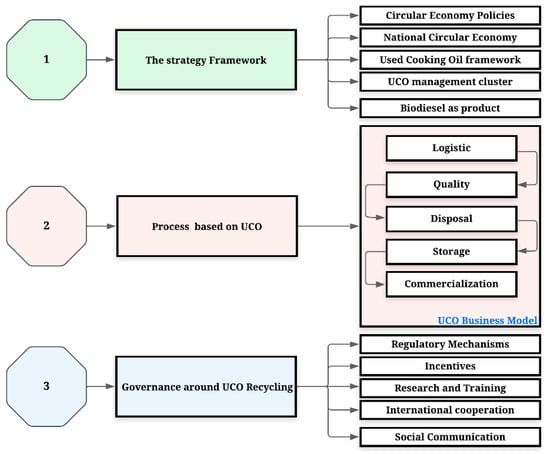Table 3 outlines the conceptual framework, including circular economy definitions, national circular economy strategy, UCO Framework (generator, manager), and second-generation biodiesel framework. The phase points out the recycling process of UCO. This strategy focuses on creating a plan to manage UCO and produce biodiesel, ultimately driving economic growth. This plan consists of three key components. The first involves developing a strategic framework for UCO recycling, using Barranquilla and the Atlantic Department as reference case studies. The second outlines the process of converting UCO into biodiesel to support the business model. The third component addresses governance mechanisms surrounding UCO improvements to maintain and support the strategy, such as regulations, incentives, research, training, cooperation, and social communication.
