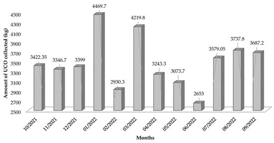Figure 4 presents the monthly reception of UCO at each company. During analysis, it was observed that the month with the highest amount of waste collected was January, with a total of 4469.7 kg. This increase was related to vacations. The occupation in restaurants, hotels, and other commercial establishments is the highest, which increases the production of UCO. The daily average of storage for each company varies between 57.67 kg and 97.17 kg of UCO, which represents a significant amount.