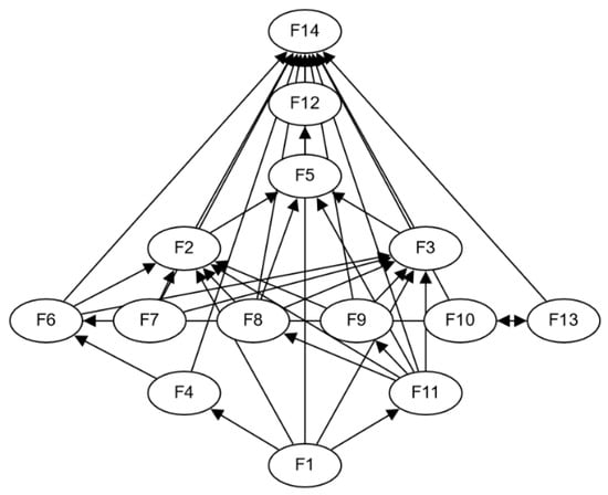 On the basis of Table 2, an explanatory structural model diagram of urban–rural integration was obtained through the iterative calculation of some column matrices (see Appendix A Table A1, Table A2, Table A3 and Table A4), as shown in Figure 2. As illustrated in Figure 2, homestead land rights confirmation (F1) serves as the foundational factor and primary driver of urban–rural integration, positioned at the core of the system. As a core driving factor, F1 exhibits the most extensive influence, acting as the critical origin of the cascading changes across multiple variables. While F2, F3, and F4 do not directly drive numerous downstream factors, they indirectly affect F6, F7, F8, F9, and F14 through the mediating role of F1. Notably, F5 exclusively influences F12 and F14, underscoring its importance within specific causal pathways.