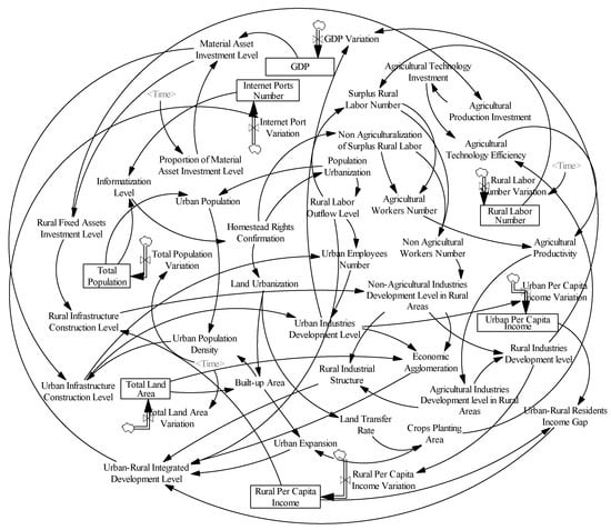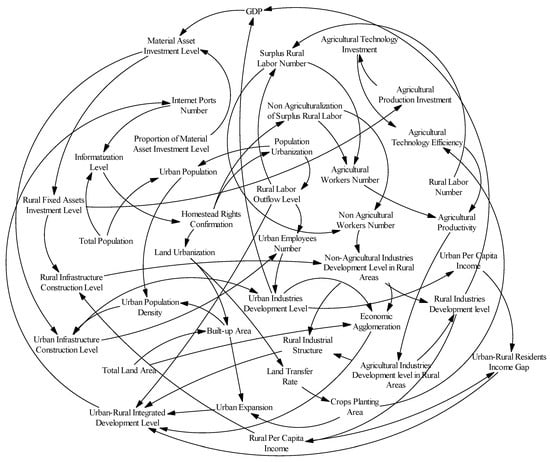 Establishing causal relationships forms the logical foundation of system dynamics analysis and constitutes the core of model construction. Urban–rural integration is characterized by the organic linkage of urban and rural structures, directed factor flows, and effective functional convergence, evolving through interactions among key elements such as population, land, and industry. Consequently, this study decomposes the urban–rural integration system into two interdependent but interconnected subsystems, namely urban and rural, with population, land, and industry serving as critical drivers of system operation.