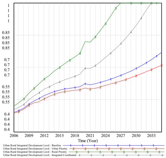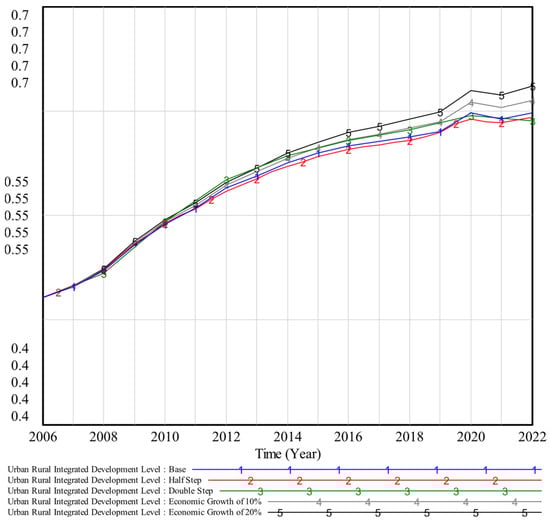 Figure 5 presents the simulation results of the urban–rural integration model under scenarios with adjusted step sizes and economic fundamental parameters. As shown, the simulated levels of urban–rural integration exhibit no significant fluctuations across different settings, indicating that the system model developed in this study has successfully passed the sensitivity test and confirming its validity.