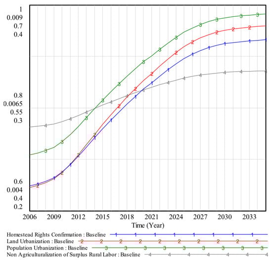 Historical validity testing of the model involves comparing simulated values with historical statistical data to assess the model’s effectiveness through the error-fitting degree. If the vast majority of errors are controlled within 10%, the model is considered valid for further simulation and forecasting. Given the complexity of the variables in this system dynamics model, only the level of urban–rural integration development and the three variables closely related to the characteristics of urban–rural integration development, namely the per capita income level of urban residents, the per capita income level of rural residents, and population urbanization, are selected for testing, with the results shown in Table 3. The results demonstrate a significant fitting performance, with nearly all errors confined within 10%. This indicates that the constructed system dynamics model exhibits high precision, effectively simulating real-world urban–rural integration scenarios and enabling reasonable predictions of how homestead rights confirmation policies will impact integration trends in the future.