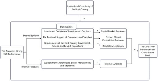 Although existing research has touched upon the role of ESG in enterprise internationalization, a systematic investigation focusing on its long-term performance in cross-border M&As remains a significant gap. A significant body of literature primarily discusses the impact of ESG on internal corporate performance [25]. These studies generally find that positive ESG performance was associated with enhanced financial performance, higher innovation levels, lower financing constraints, and increased corporate value [25]. These findings affirm the importance of ESG from the perspective of internal operations and provide a foundation for this study to explore the role of ESG in the more complex context of cross-border M&A scenarios.